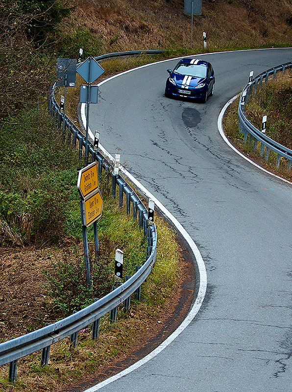 Die Bimm-Kurven sind eine Links-Rechts-Links-Kombination gesäumt von schützenden Leitplanken, sonst würde es bei fehlendem Talent zielgerichtet den Abhang hinab in den Oswaldtalbach gehen. Zum Zeitpunkt der Namensgebung waren die Planken allerdings nicht vorhanden. Aus Rücksicht auf die Clubzugehörigkeit von Tourguide Ronny, sollen wir die Geschichte aber nicht weiter thematisieren. Rund 300 Meter weiter folgt eine Haarnadel bergauf im dunklen Wald, genannt „Dampfwalzenkurve“. Der eingefleischte Fan kennt die Stelle, hier gibt’s immer die schönsten Drifts zu sehen.