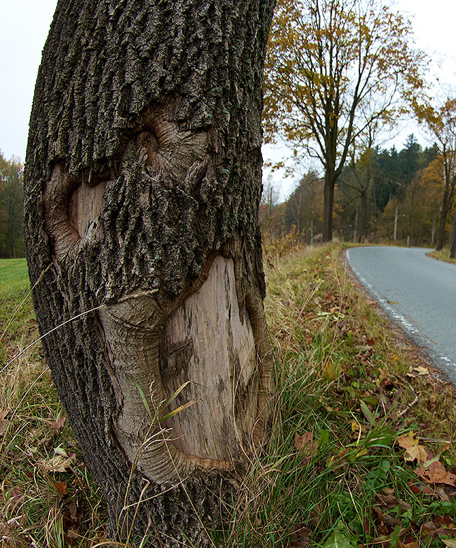 Nach einer „Rechts4 cut“ – man merkt Ronny seine aktive Zeit als Rallyefahrer durchaus an – geht es zügig vorbei an einer „Kureinrichtung“ zu den „Forsthäuserkurven“. Wieder eine sehr schnelle rechts-links-Kombination, welche bereits gestandenen Rallyegrößen wie Ruben Zeltner zum Verhängnis wurden. Die tiefe Wunde im Baumstamm zeugt noch immer vom bösen Einschlag, den der Sachsenring-Chef als „seinen heftigsten Abflug“ charakterisiert. Ronny erzählt uns, dass früher hier wie wild gecuttet wurde und pro Durchgang mitunter drei Fahrzeuge schwerste Kaltverformungen davontrugen, welche einer Weiterfahrt entgegenstanden. Seit einigen Jahren wird das Kurvenschneiden durch Strohballen und Reifenstapel unterbunden, wodurch sich die Halbwertzeit der Rallyefahrzeuge spürbar verlängerte.