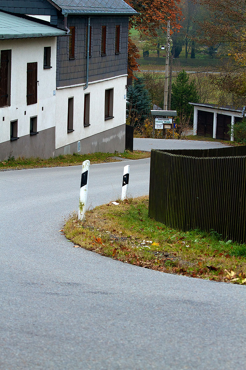 Kurz darauf passieren wir wieder den Ortseingang und steuern in einer schnellen Links „Rechts3 in Links3 bergauf “ über eine Brücke, um uns den „Mühlkurven“ zu nähern, benannt nach der dort befindlichen Gaststätte „Untere Mühle“. Gegenüber wohnt ein, sagen wir mal, suboptimal-rallyebegeisterter Anwohner, dessen Zaun magische Anziehungskräfte auf einige Fahrer hat. Ronny wird sichtlich nervös, offensichtlich will man den einzigen Nicht-Rallyefan im Umkreis von 50 Kilometern nicht durch zusätzliches Fotografieren reizen. Aber was muss das muss, schließlich will die Weltöffentlichkeit wissen, wie es hier aussieht. Basta! Ausgangs der Mühlkurven werden wir noch auf den Baumstumpf hingewiesen, an dem in den frühen 1990er Jahren ein gewisser Harald Demuth einen 190er Mercedes zerschellen ließ. Wie bereits erwähnt, die zunächst unscheinbar wirkenden vier Kilometer Grünhain-WP haben nicht umsonst einen legendären Ruf.