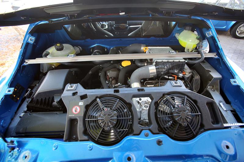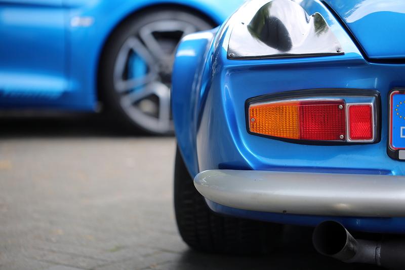 Nun steht eines dieser ersten Exemplare vor uns. Natürlich im klassischen Metallic-Blau. „Ein Ferrari muss ja auch Rot sein“, sagt Jens Schäfer, der Junior. Doch auch ohne den markanten Farbton, der offiziell ‚Bleu Alpine‘ heißt, wird die Verwandtschaft mehr als deutlich. Die runden Zusatzscheinwerfer an der Front, die Längsrippe auf der Fronthaube, die Einkerbungen an den Fahrzeug-Flanken, die schräg abfallende und weit in die Seiten gezogene Heckscheibe – die Designer der neuen A110 haben die Formensprache des Klassikers intensiv studiert und sie ins neue Jahrtausend transferiert. Einzig das von dem mächtigen Mittel-Diffusor geprägte Heck tanzt etwas aus der Reihe.