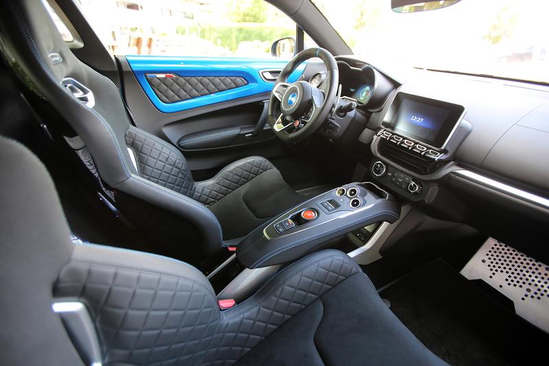 Die Einladung nehmen wir gerne an. Das Cockpit der 2017er-A110 versetzt einen in eine andere Welt, bringt einen aber nicht nur deswegen zum Staunen. Die alte Alpine verzaubert durch ihren Purismus, die neue durch die Liebe zum Detail. Gestepptes Leder an den Innentüren und den 13,1 Kilogramm leichten Schalensitzen erinnert an das berühmte Vorbild, dazu unterstreichen Kevlar-Elemente in Armaturenbrett und Mittelkonsole die Leichtbau-Philosophie der Marke Alpine.