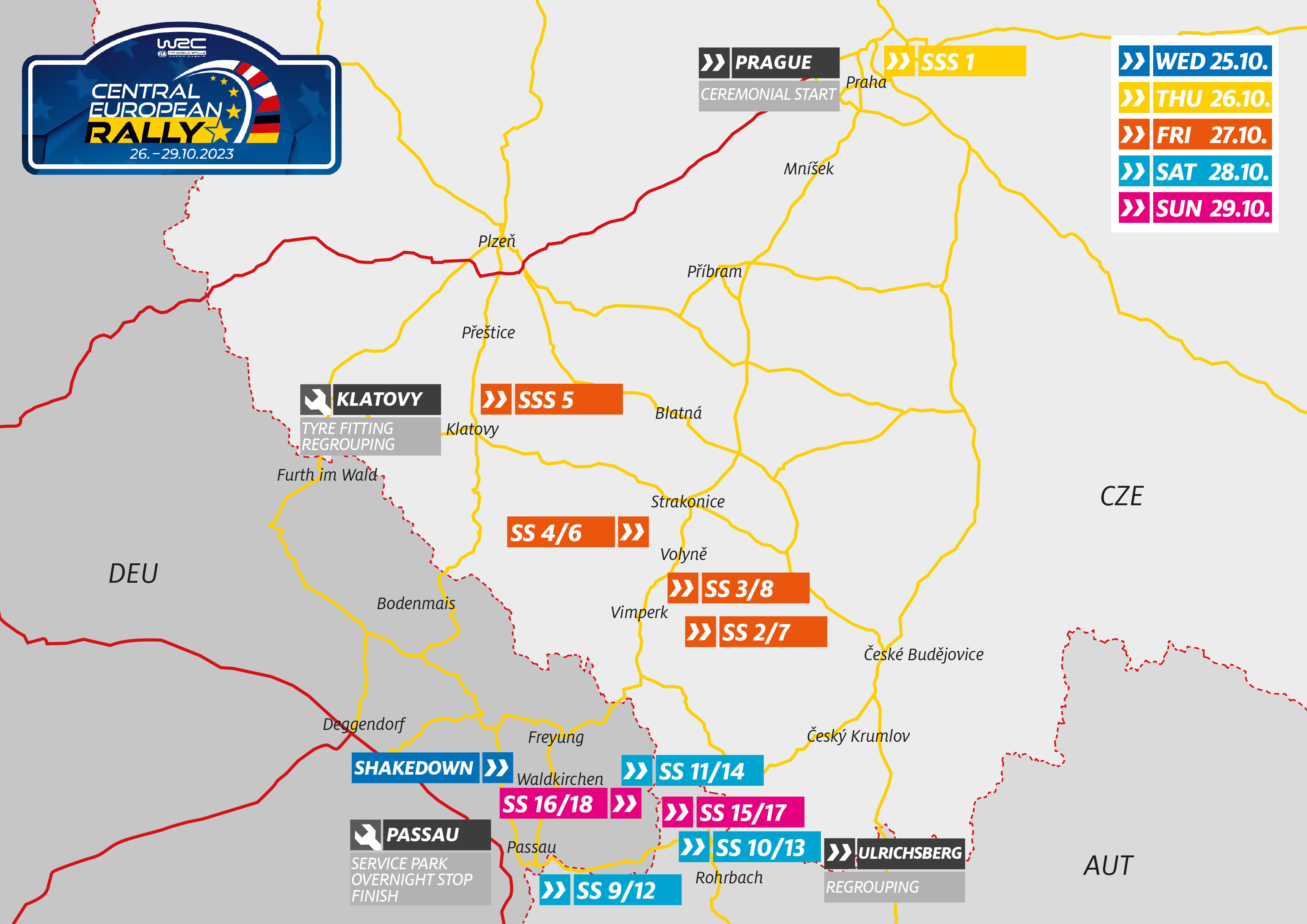 Ab 16 Uhr geht es bei Tittling zur Sache, wenn die Teams mit ihren Einsatzfahrzeugen zum Shakedown antreten. Auf der knapp über drei km langen Strecke im Dreiburgenland nördlich von Passau gibt es noch einmal einen finalen Check unter Praxisbedingungen, bevor es zum Servicepark an der Dreiländerhalle im südlichen Passauer Stadtteil Kohlbruck geht. Sowohl beim Shakedown als auch im Servicepark ist der Eintritt frei. In Passau bleiben die Fahrzeuge aber am Mittwoch nicht über Nacht, denn noch am Abend geht es auf die Reise ins gut 230 km entfernte Prag.