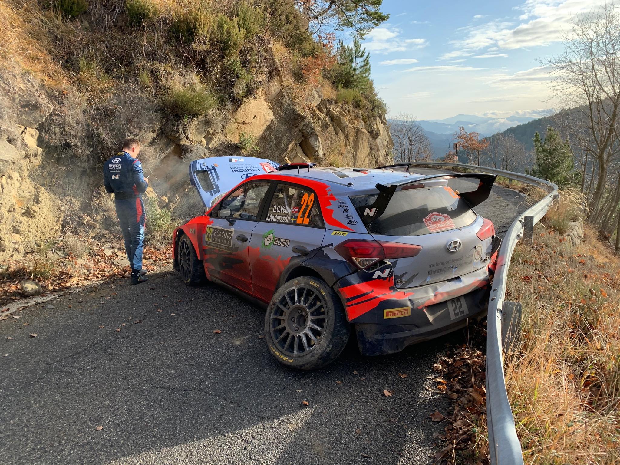 Die drittletzte Prüfung der Rallye Monte Carlo musste unterbrochen werden, nachdem Hyundai-Pilot O.C. Veiby auf der schmalen Straße in die Leitplanken knallte und die Strecke blockierte. Der Norweger hatte bis zu diesem Zeitpunkt auf dem zweiten Platz der WRC2-Wertung gelegen. Diese führt weiterhin Landsmann Mads Östberg (Citroën) an.